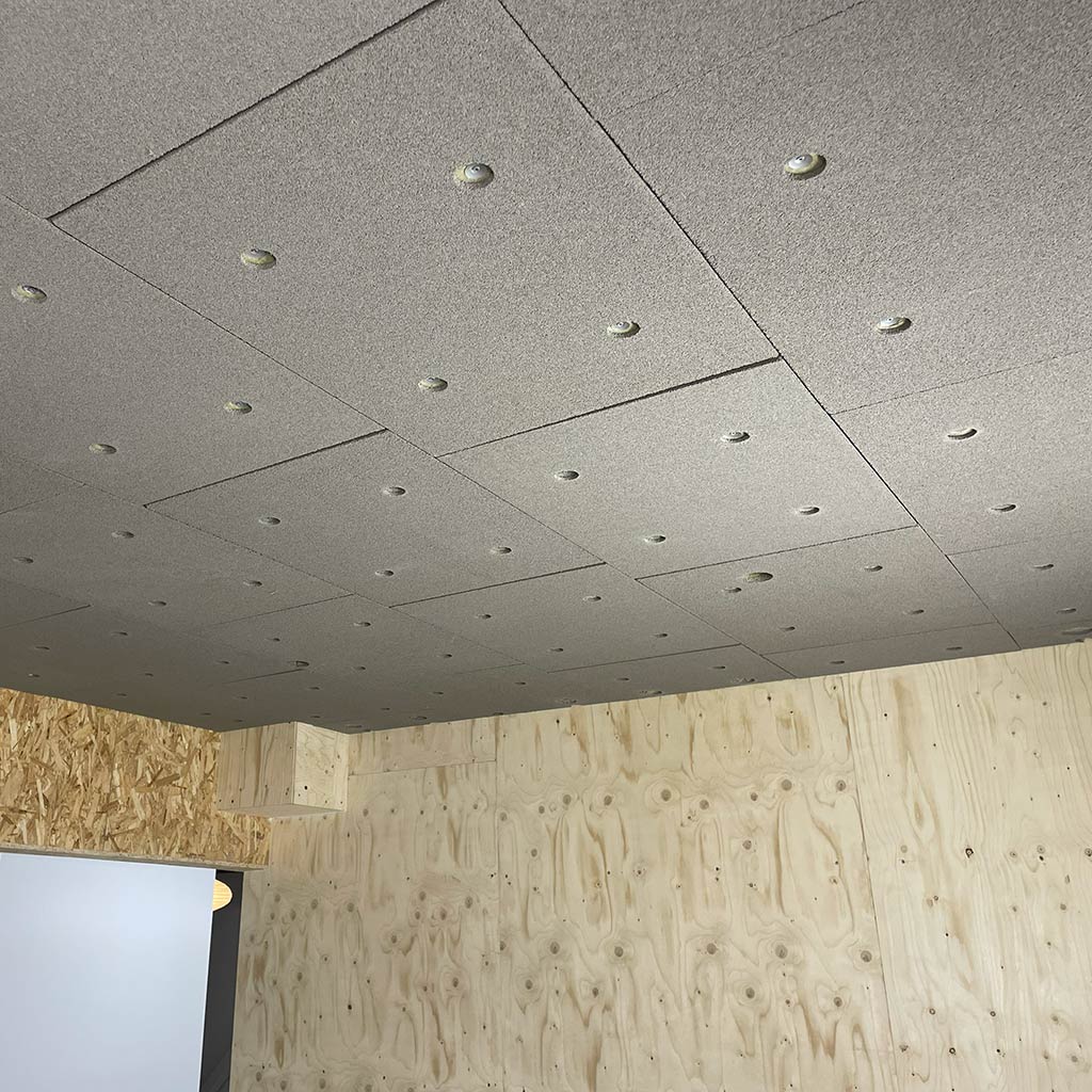 Hz Dual monteres ved, at akustikpladerne skrues fast via de forborede huller i glasgranulatpladen. Det giver en stabil og sikker montering på forskalling eller direkte på faste underlag, hvor limning ikke er ønskelig eller mulig. De forborede huller dækkes efterfølgende med propper, så overfladen fremstår ensartet og klar til videre behandling.